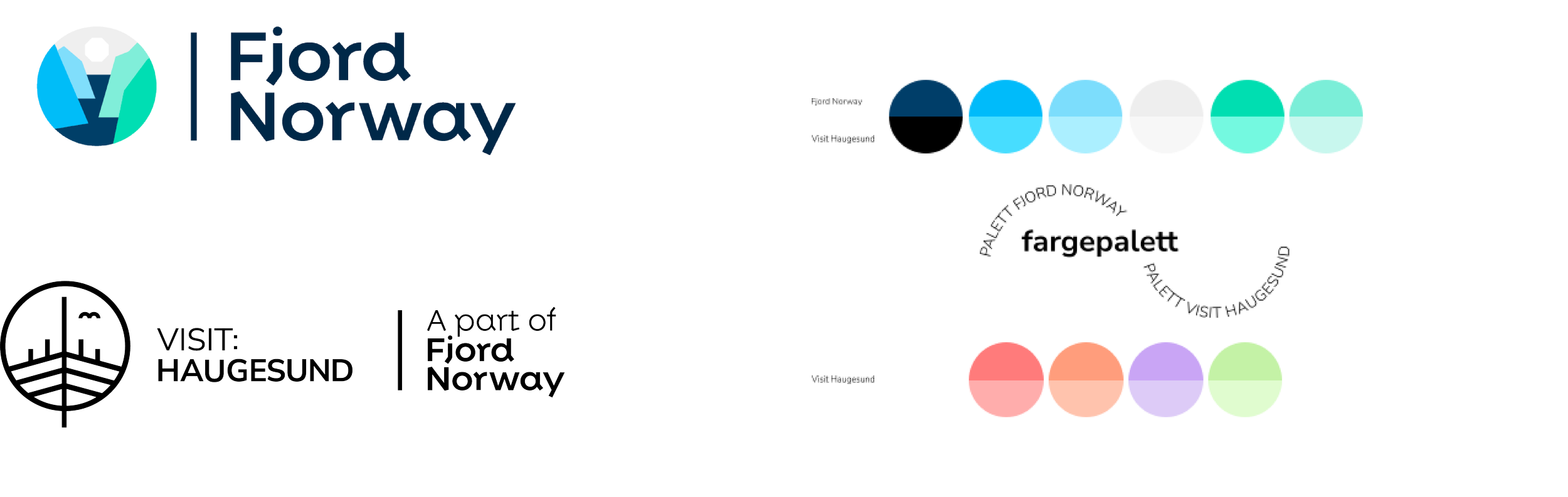 Fargepaletten bygger på Fjord Norway sine farger, men i en mykere og lysere tone. Vi har også lagt til komplementærfarger inspirert av regionens natur og solnedganger; rosa, lilla og varme toner som gir kontrast og liv. Svart følger oss videre som en tydelig referanse til runenes visuelle uttrykk - et rått og moderne preg.